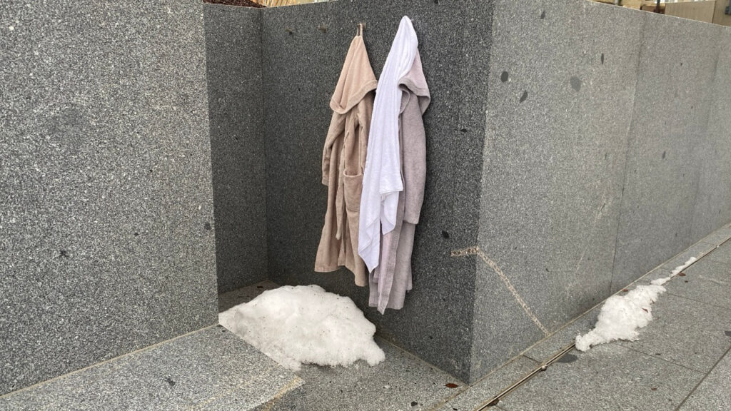 Die Bademäntel über Resten von Schnee aufgehängt.
