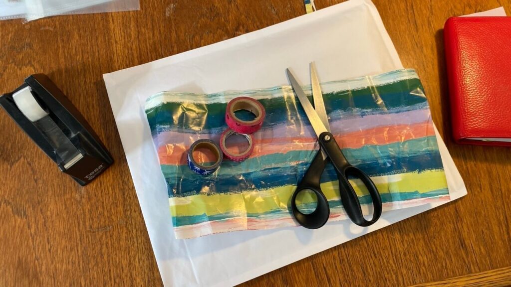 Ich mache Platz auf meinem Tisch und verpacke ein Geburtstagsgeschenk – es hat noch eine Reise vor sich.