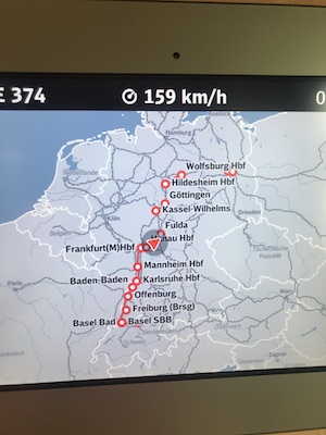 Mannheim, genug Zeit für einen Kaffee, den ich mit Karte zahle. Während ich auf den ICE nach Berlin warte rollt am Gleis hinter mir mein Zug aus Stuttgart ein, pünktlich.